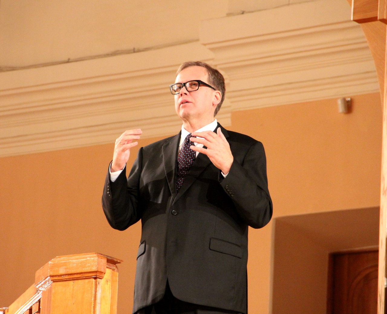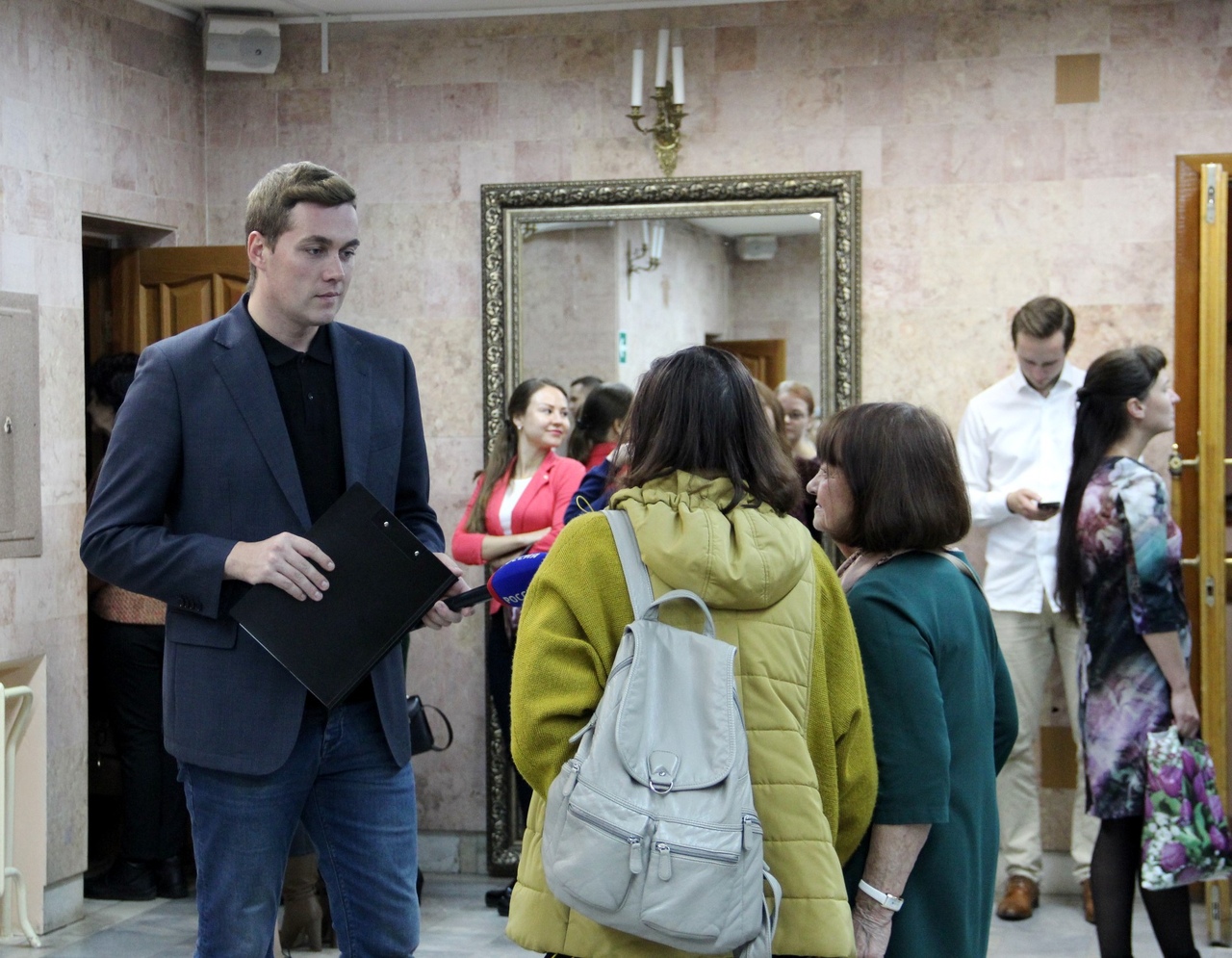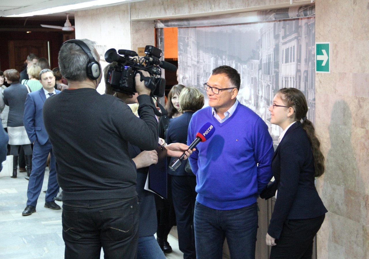 Виктор Ряхин: «Я хотел бы сказать, что я очень рад видеть вас всех в зале сегодня. Мне очень приятно приезжать в Архангельск, выступать в этом зале и играть на этом органе».