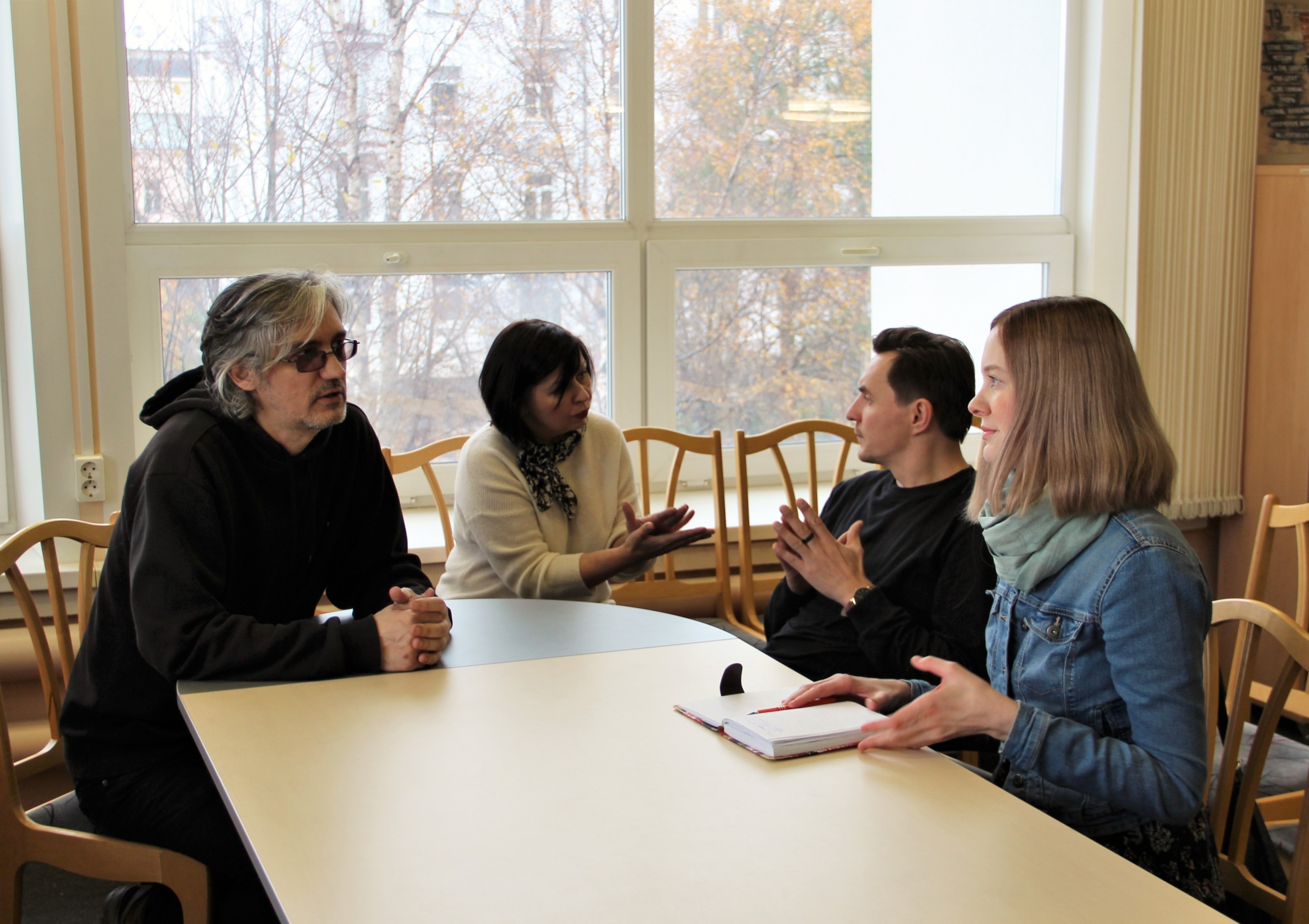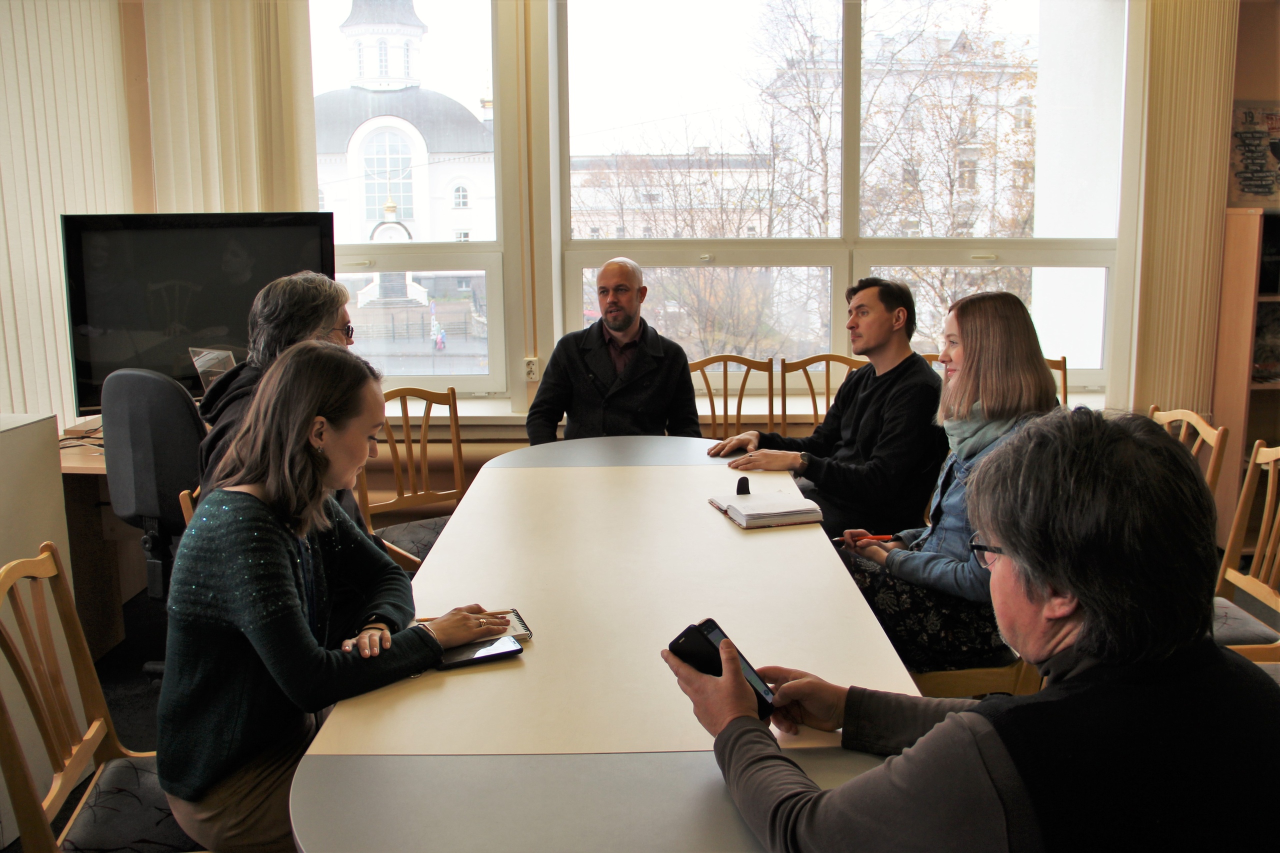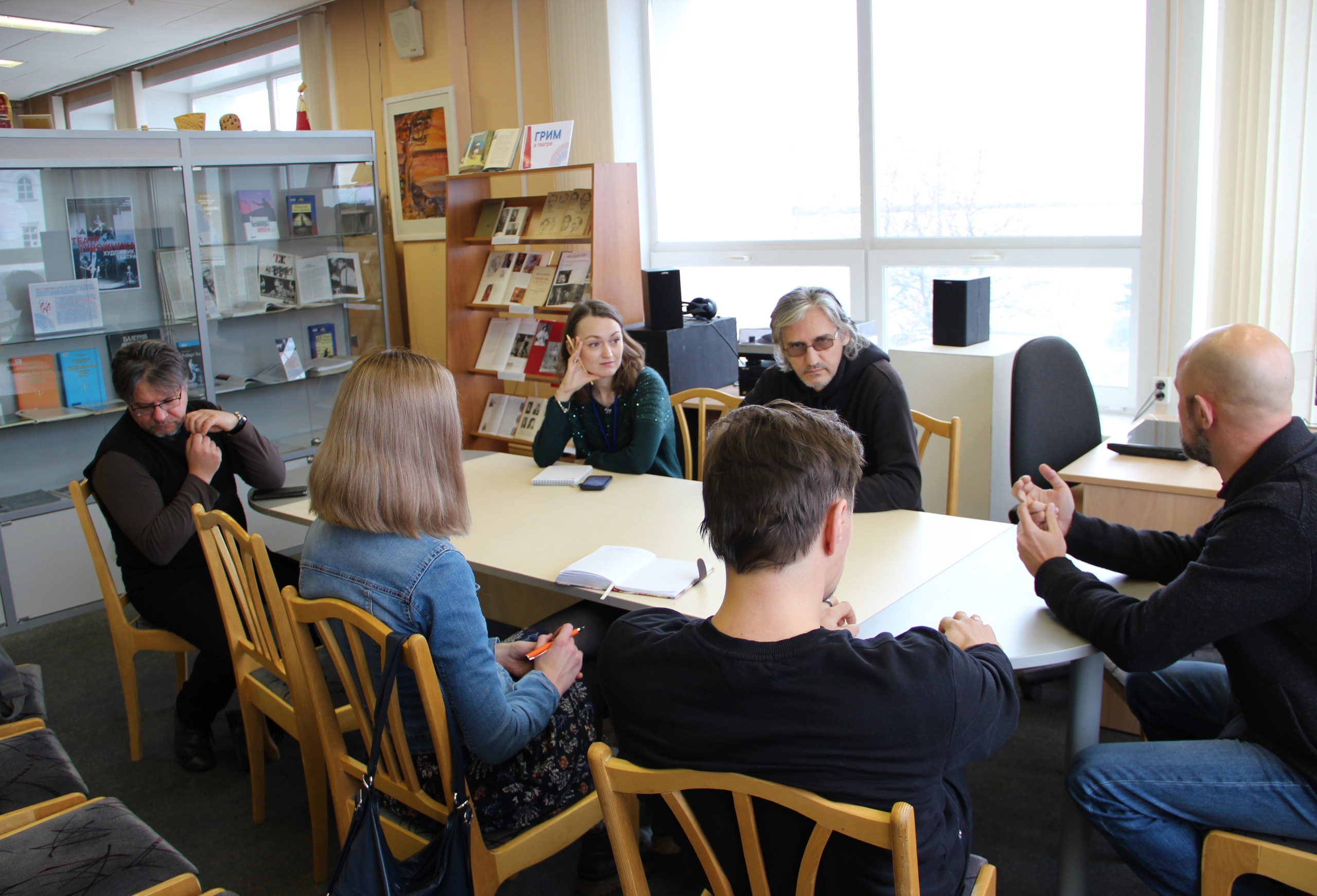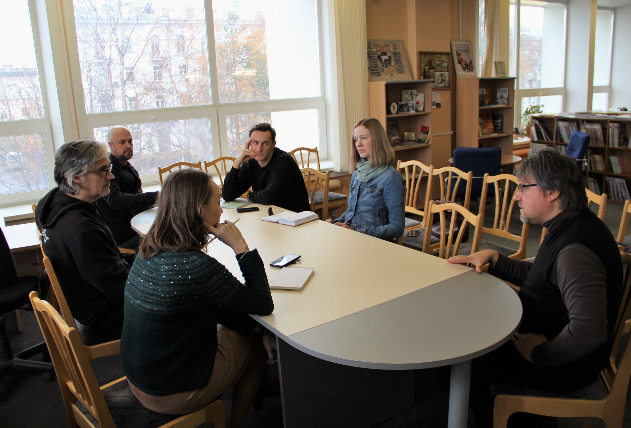 На фото – Наталья Яницкая из Архангельской областной научной библиотеки им. Н.А.Добролюбова, Степан Полежаев из Молодёжного театра, Владимир Онуфриев, Василий Ларионов и Анна Святославова из Поморской филармонии и вольный художник Сергей Жигальцов.