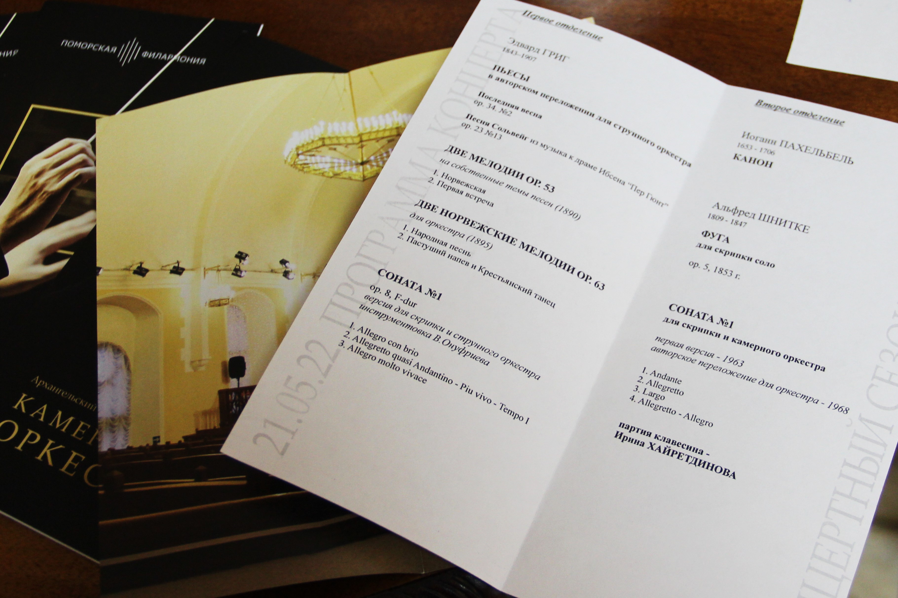 Первое отделение концерта было посвящено музыке Эдварда Грига – для слушателей прозвучали его пьесы в авторском переложении для струнного оркестра «Последняя весна» и «Песня Сольвейг» из музыки к драме Генрика Ибсена «Пер Гюнт», а также Две норвежские мелодии для оркестра op. 63 («Народная песнь», «Пастуший напев» и «Крестьянский танец») и Соната №1 op.8 F-dur (версия для скрипки и струнного оркестра, инструментовка Владимира Онуфриева).
