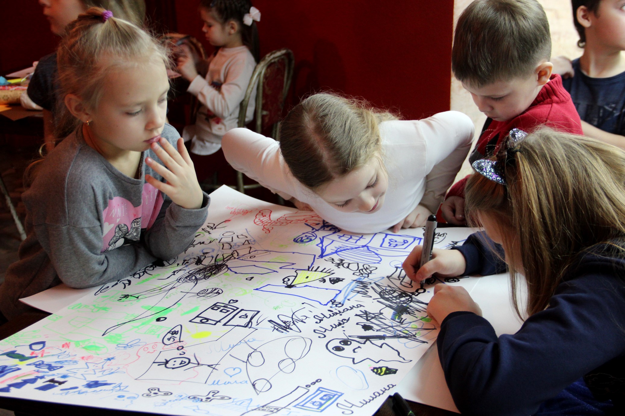 В фойе развернулась большая битва между армиями Щелкунчика и Мышиного короля. Стоило заиграться и пропустить сигнал ведущего – и ты уже перешёл в команду противника! А в самом Камерном зале ребята искали волшебные предметы и пересчитывали сокровища из сказочного клада. Маленькие искатели приключений побывали даже в замке с привидениями. Маленькое Привидение из сказочной повести немецкого писателя Отфрида Пройслера поселилось в замке-музее и очень хочет знать, что творится в большом мире. Полина Никитина предложила ребятам нарисовать всё самое важное, чем хочется поделиться с Привидением.